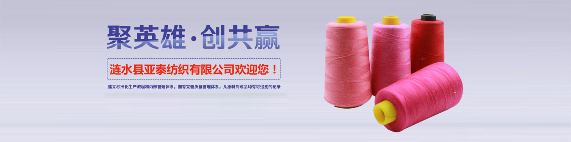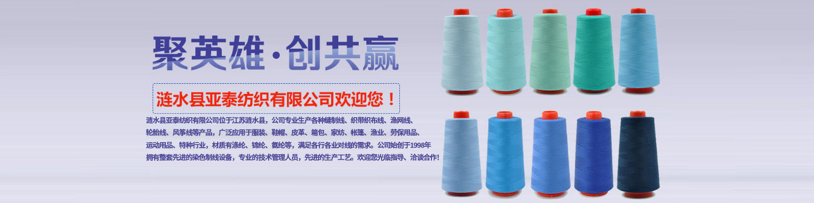 漣水縣亞泰紡織有限公司位于江蘇漣水縣,公司專(zhuān)業(yè)生產(chǎn)各種縫制線、織帶織布線、漁網(wǎng)線、輪胎線、風(fēng)箏線等產(chǎn)品,廣泛應(yīng)用于服裝、鞋帽、皮革、箱包、家紡、帳篷、漁業(yè)、勞保用品、運(yùn)動(dòng)用品、特種行業(yè),材質(zhì)有滌綸、錦綸、氨綸等,滿(mǎn)足各行各業(yè)對(duì)線的需求。公司始創(chuàng)于1998年,擁有整套先進(jìn)的染色制線設(shè)備,專(zhuān)業(yè)的技術(shù)管理人員,先進(jìn)的生產(chǎn)工藝。歡迎您光臨指導(dǎo)、洽談合作!